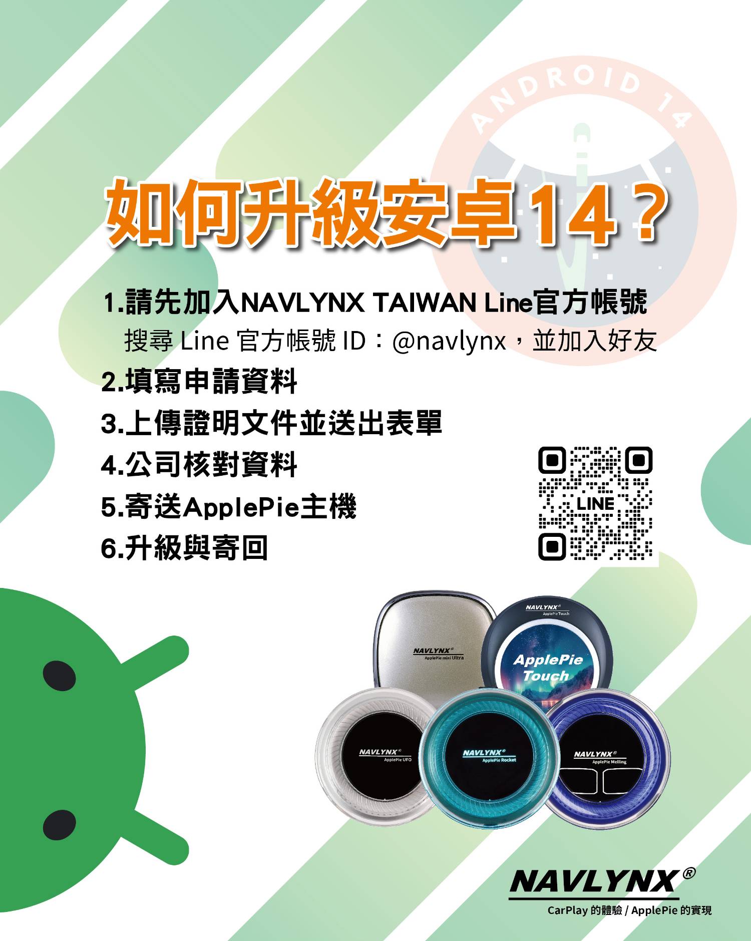 為提供更穩定流暢的使用體驗,NAVLYNX ApplePie 現已開放升級至 Android 14 作業系統,即日起可透過以下流程進行申請: